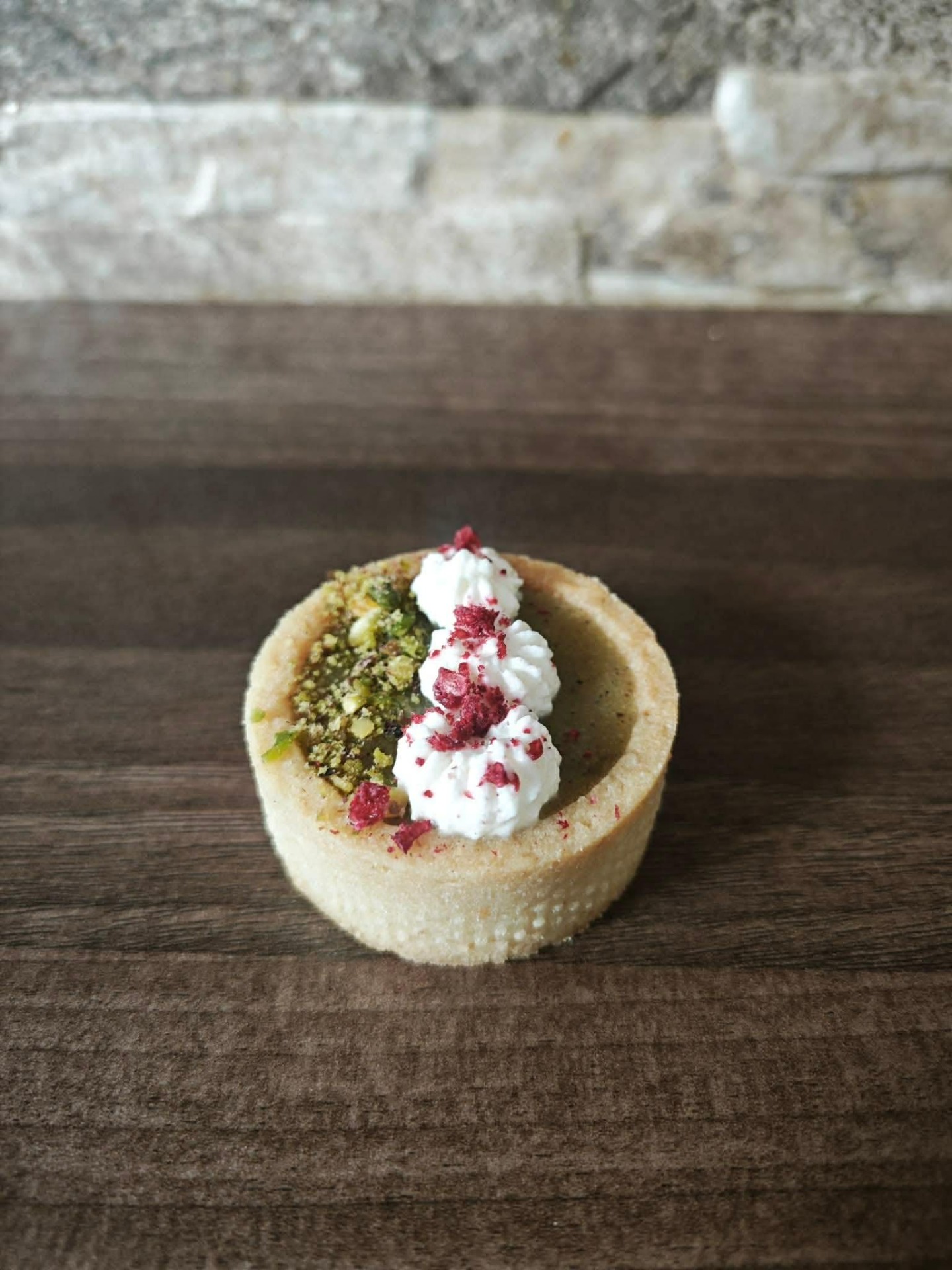 Malá křehká tartaletka plněná jemnou pistáciovou náplní s průměrem 5cm.